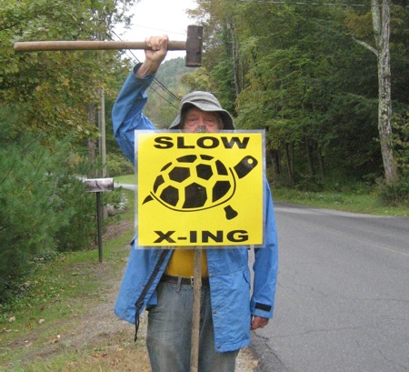 Almost as soon as J. C. and I put up the signs, somebody knocks them down. The signs that we post along the river road, downstream of Conway center, read “Slow-Turtle Xing”.